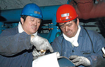 | 七煤集團(tuán)公司董事長(zhǎng)、黨委書記劉文波(右一)和七煤集團(tuán)公司總經(jīng)理王洪木(左一)經(jīng)常深入井下作業(yè)現(xiàn)場(chǎng)解決實(shí)際問題。 |