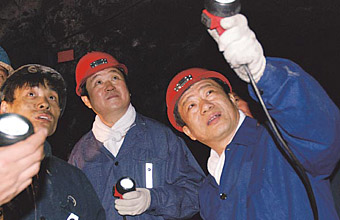 龍煤集團(tuán)黨委書記、總經(jīng)理侯仁(右一)在七煤集團(tuán)井下檢查安全生產(chǎn)工作。 |