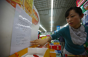 消費(fèi)者在北京一超市閱讀牛奶的檢驗報告。新華社記者 邢廣利