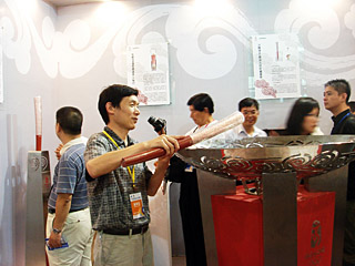 | 第五屆專博會上,參展觀眾對華帝公司展出的奧運(yùn)祥云火炬、圣火盆產(chǎn)生了濃厚興趣。本報(bào)記者 肖思思