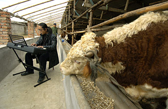 “禿頭,乖,別動”,劉海川一邊梳毛,一邊不停地給禿頭說話。禿頭是劉海川養(yǎng)牛場的一頭牛,因為沒長角,被他稱作禿頭。與禿頭一樣,這里的幾十頭牛都有自己的名字,“我都把它們當成自己的孩子,時間長了一喊名字,它們就有反應”,劉海川說。 劉海川的養(yǎng)牛場不大,但很特別,每個牛圈都安裝了音箱,這讓禿頭和其它幾十頭牛每天能聽到美妙的鋼琴曲。每當《梁!返葍(yōu)美的曲子響起,這些牛變得溫順,用劉海川的話說“牛脾氣不見了,好管理了”。 2007年5月開辦養(yǎng)牛場后,劉海川遇到過問題,但勤奮好學的他每次都能找到解決辦法。 一次偶然的機會,長時間不彈鋼琴感覺技癢的劉海川在養(yǎng)牛場彈鋼琴,彈著彈著,他發(fā)現(xiàn)聽到琴聲后,安靜的牛群有了動靜。伴隨著激昂或柔美的琴聲,牛群時而狂躁,時而悠閑。 查閱大量資料后,劉海川發(fā)現(xiàn),在國外早就有飼養(yǎng)員給牛聽音樂的事例。從那以后,每逢晴天,劉海川就把鋼琴搬到院里,給牛彈各種柔美的曲子。天氣變冷,劉海川擔心鋼琴長時間在戶外不利于保養(yǎng),就在各個牛圈里裝上音箱,每天定時給牛群播放鋼琴曲。 一段時間后,“對牛彈琴”不僅使牛聽話了,牛肉也變得更好吃了。不少客戶品嘗了劉海川的牛肉后,表示味道鮮美,F(xiàn)在,劉海川養(yǎng)的牛銷路好,每批牛都提前接到訂單,價格也不錯。