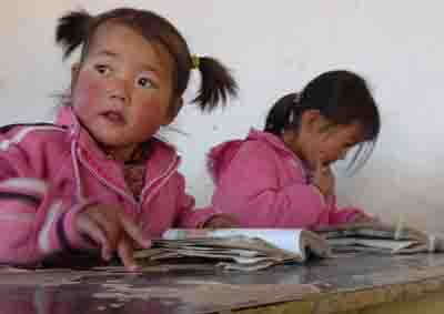 12月1日,在隴南市武都區(qū)安化鎮(zhèn)雙廟村的教學(xué)點(diǎn),一年級(jí)學(xué)生宋小倩(左)和同桌王娟麗用手指蘸著唾沫,在課桌上練習(xí)老師剛剛教過的生字。 |