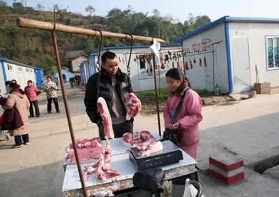 12月13日,在四川省北川縣漩坪鄉(xiāng)宛建小區(qū),居民在市場(chǎng)購(gòu)買肉類食品。經(jīng)受地震重創(chuàng)的北川羌族自治縣群眾的生活已逐漸步入正軌。在干凈的活動(dòng)板房里,他們吃穿不愁,看電視、上網(wǎng)都很方便。新華社發(fā) |