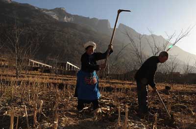 四川省汶川縣雁門鄉(xiāng)蘿卜寨是中國(guó)現(xiàn)存規(guī)模最大的黃泥羌寨,以“云朵上的街市,古羌王的遺都”而名滿天下,被譽(yù)為“中國(guó)第一羌寨”。12月8日,兩位蘿卜寨村民在田里勞作,為來年春耕做準(zhǔn)備。他們的身后,是正在修建的新房。新華社記者:陳燮