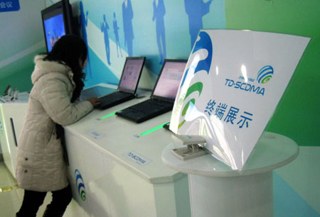 1月7日,消費(fèi)者在北京一家中國(guó)移動(dòng)展廳體驗(yàn)3G手機(jī)的上網(wǎng)功能。新華社記者:邢廣利