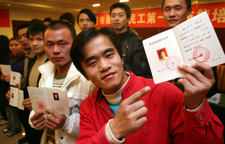 四川返鄉(xiāng)民工參加“訂單培訓(xùn)”再就業(yè)。1月12日上午,四川華鎣市接受職業(yè)技能培訓(xùn)的返鄉(xiāng)農(nóng)民工高興地領(lǐng)到培訓(xùn)證書。他們將帶著一技之長,按“訂單”分赴各自的工作崗位再就業(yè)。新華社發(fā)(邱海鷹