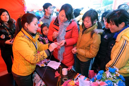 節(jié)前送崗位,過年也安心。1月14日——15日,江西東鄉(xiāng)縣勞動(dòng)就業(yè)部門組織舉辦了返鄉(xiāng)農(nóng)民工專場招聘會(huì)。剛從廣東東莞返鄉(xiāng)的胡霞(右四)等正在南昌唯美創(chuàng)意絲網(wǎng)花招聘臺(tái)前學(xué)做絲網(wǎng)花。新華社記者:宋振平