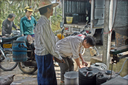 2008年12月20日,瓊海市石壁鎮(zhèn)的群眾正在出售膠乳。 受金融危機(jī)影響,2008年下半年以來(lái),海南橡膠價(jià)格一路走低,目前膠價(jià)每噸降至萬(wàn)元以下。為保護(hù)農(nóng)民利益,海南農(nóng)墾以12000元每噸的保護(hù)價(jià)收購(gòu)橡膠,切實(shí)保護(hù)農(nóng)民利益。新華社發(fā)(蒙鐘德攝) | 2009年春節(jié)要來(lái)臨的時(shí)候,北國(guó)大地依然處于最寒冷的季節(jié)。然而,在祖國(guó)最南端的海南省的農(nóng)場(chǎng)里、膠園中,卻熱流涌動(dòng)、激情澎湃。被譽(yù)為海南省體制改革一號(hào)工程、受到中央領(lǐng)導(dǎo)和社會(huì)各界廣泛關(guān)注的農(nóng)墾體制改革,正進(jìn)入了攻堅(jiān)階段。 專家指出,海南農(nóng)墾改革雖然在2008年成效顯著,但是由于各種復(fù)雜因素的影響,2009年改革面臨的困難可能比2008年更大。鑒于海南農(nóng)墾承擔(dān)著全省經(jīng)濟(jì)發(fā)展新的火車(chē)頭的戰(zhàn)略重任,這項(xiàng)改革只能成功、不能失敗。