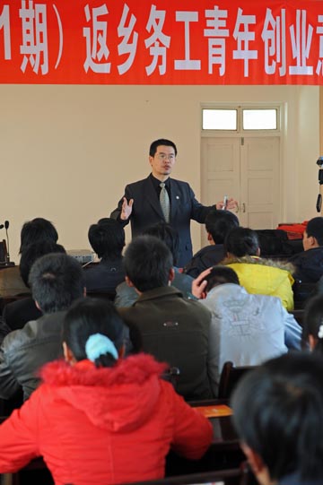 寧夏青年就業(yè)創(chuàng)業(yè)培訓(xùn)中心的老師在寧夏中衛(wèi)市興仁鎮(zhèn)為青年農(nóng)民講課。新華社記者:王鵬