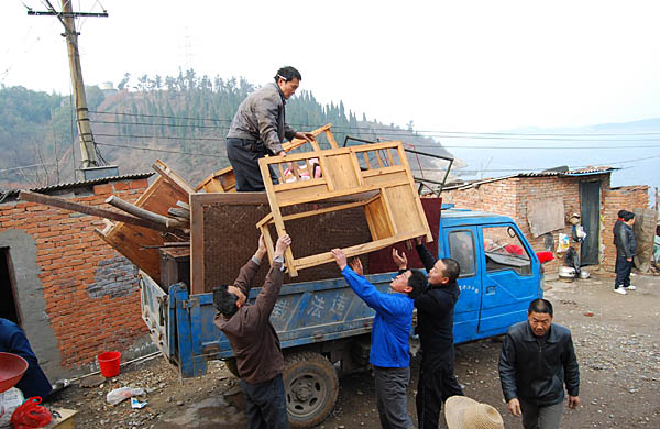 3月5日,湖北省丹江口市移民在搬遷。 當(dāng)日上午,湖北省丹江口市大壩辦事處移民新村社區(qū)的13戶移民、十堰市航運(yùn)局的15戶移民和丹江口市捕魚隊(duì)的5戶移民開始搬離大壩施工影響區(qū),這標(biāo)志著南水北調(diào)丹江口市移民試點(diǎn)搬遷安置工作全面啟動(dòng)。