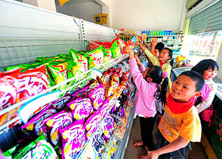 | 3月11日,大密羅村的幾名小學(xué)生在村中“小超市”購(gòu)買小食品。云南省玉溪市供銷系統(tǒng)所屬百信商貿(mào)集團(tuán),從2008年開始,補(bǔ)貼相關(guān)費(fèi)用在該市農(nóng)村建立村級(jí)“小超市”。“小超市”采取統(tǒng)一價(jià)格、統(tǒng)一標(biāo)識(shí)、統(tǒng)一物流配送及售賣方式,按批發(fā)價(jià)向村民零售貨物,農(nóng)民足不出村,即可買到實(shí)惠的日常用品。目前,這種鄉(xiāng)村“小超市”已經(jīng)覆蓋了玉溪市約25萬農(nóng)村消費(fèi)人群。新華社記者