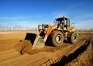 | 據(jù)國(guó)土資源部發(fā)布的最新數(shù)據(jù),在跨入2009年那一刻,全國(guó)耕地面積為18.2574億畝。圖為內(nèi)蒙古臨河區(qū)烏蘭圖克鎮(zhèn)隆強(qiáng)村8組,工程機(jī)械正在作業(yè),改良耕地。本報(bào)記者