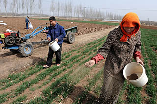 | 山東萊西市孫受鎮(zhèn)郭家莊村民何貴芳(右)正在為長勢偏弱的麥田增施速效肥,以利于增加分蘗和壯苗。新華社記者 李紫恒