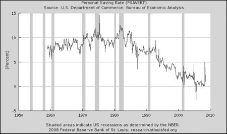 美國(guó)政府2日公布的兩份報(bào)告讓經(jīng)濟(jì)學(xué)家們感覺(jué)前景更加黯淡:由于美國(guó)人的收入連月下降,他們的消費(fèi)支出也一再萎縮,更多的人開(kāi)始存錢。美國(guó)商務(wù)部的報(bào)告說(shuō),美國(guó)人的可支配收入在去年12月下跌0.2%,連續(xù)第三個(gè)月下降。個(gè)人消費(fèi)下滑了1%,意味著美國(guó)人一個(gè)月少花了1024億美元。這不僅是連續(xù)第6個(gè)月下降,也是半個(gè)世紀(jì)以來(lái)持續(xù)時(shí)間最長(zhǎng)的。與此同時(shí),美國(guó)人的儲(chǔ)蓄率開(kāi)始上升。去年12月個(gè)人儲(chǔ)蓄上漲了3.6%,全年平均增長(zhǎng)1.7%,這幾乎是2007年數(shù)字的三倍。美聯(lián)社說(shuō),2004年美國(guó)人平均儲(chǔ)蓄率是0.4%,2005年還曾經(jīng)一度變?yōu)樨?fù)值,如今這一趨勢(shì)正在扭轉(zhuǎn)。