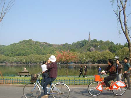 租騎公共自行車在杭州白堤游玩的游客。本報記者:孫金霞