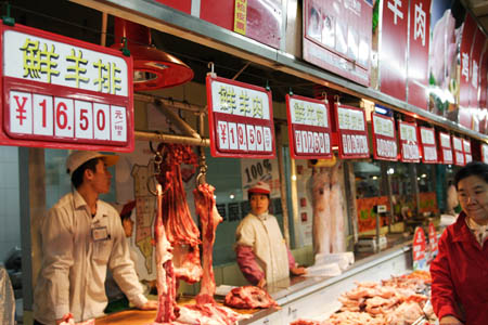 據(jù)國家統(tǒng)計局內(nèi)蒙古調(diào)查總隊數(shù)據(jù),今年一季度牛羊肉價格上漲,上漲幅度為1.5%;钆C抗14.22元,比上年同期上漲9.5%;活羊每公斤12.32元,比上年上漲9.7%。據(jù)分析,肉類價格上漲的主要原因是:品質(zhì)優(yōu)良的牛羊肉品外銷增加,近幾年國家的封山禁牧政策使牛羊肉總供應(yīng)量減少;食品加工業(yè)和餐飲業(yè)的發(fā)展帶動肉食需求量的增加,這些因素拉動了牛羊肉市場價格的上漲。圖為一名顧客(右)在呼和浩特一家超市內(nèi)選購牛羊肉。 |