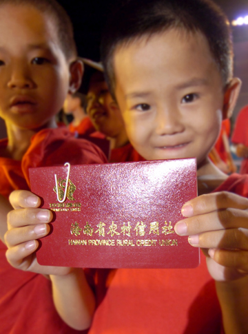 海南省近日啟動(dòng)首屆“我愛(ài)海南”資助百名孤兒捐助儀式,海南各市縣的100名孤兒將受到無(wú)償資助直至大學(xué)畢業(yè)。圖為一名孤兒手拿愛(ài)心企業(yè)捐助的銀行存折!⌒氯A社記者