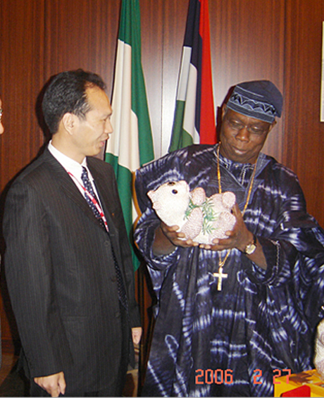 越美集團(tuán)總裁徐志明向尼日利亞總統(tǒng)贈(zèng)送禮品。 |