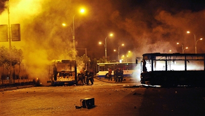 5日晚上,烏魯木齊發(fā)生打砸搶燒嚴(yán)重暴力犯罪事件。在此次事件中,烏魯木齊被毀車輛達(dá)260部,其中190部公交車,50多部民用車;受損門面房203間,民房14間,總過火面積達(dá)到56850平方米,全市共有220多處縱火點,有兩棟樓房被燒毀。