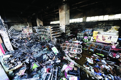 7月6日,烏魯木齊市一家被燒毀的超市一片狼藉。新華社記者沙達(dá)提