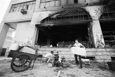 7月6日,烏魯木齊市一家超市的經(jīng)營者在自己被焚毀的商店外整理貨物。