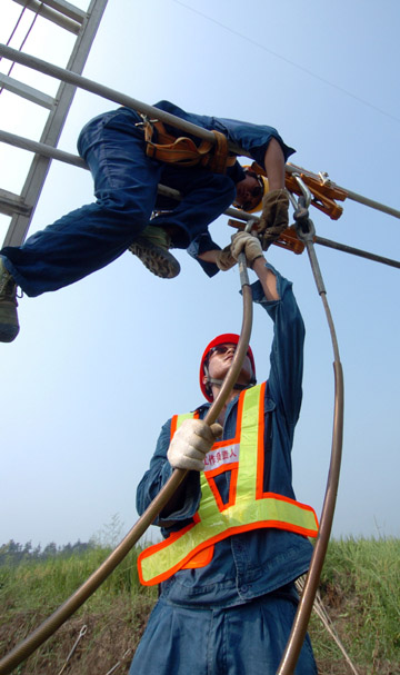 8月26日,工作人員正在安徽省宣城市廣德縣境內(nèi)的特高壓直流輸電線路示范工程皖4標(biāo)段施工。 向家壩至上海特高壓直流輸電工程是世界上電壓等級最高、輸送容量最大、送電距離最遠(yuǎn)、技術(shù)水平最先進(jìn)的高壓直流輸電工程,西起四川復(fù)龍換流站,東至上海奉賢換流站。工程途經(jīng)四川、重慶、湖南、湖北、安徽、浙江、江蘇、上海等8省市,4次跨越長江。目前,工程進(jìn)展順利,安徽段已經(jīng)進(jìn)入“放線”階段。