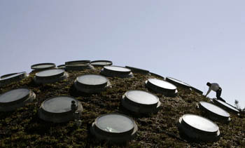 2008年9月18日,在美國加利福尼亞州的舊金山市,一名工人爬上科學研究院的“活屋頂”。所謂“活屋頂”便是在現(xiàn)代建筑的頂部種草以增加綠植覆蓋,減少溫室氣體。 |