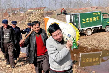 莒縣郵政三農(nóng)服務(wù)車開到田間地頭。(資料照片) | 針對農(nóng)民長期面臨的農(nóng)資“買難”問題,近年來,山東省郵政依托遍布城鄉(xiāng)的網(wǎng)絡(luò)優(yōu)勢,構(gòu)建“省-市-縣-鄉(xiāng)-村”五級分銷配送網(wǎng)絡(luò),開辟農(nóng)村流通市場,較好滿足了農(nóng)民多元化需求,促進了農(nóng)民增產(chǎn)增收,又拉動了農(nóng)村消費。 交通運輸部、商務(wù)部、農(nóng)業(yè)部、國家郵政局和中國郵政集團公司等部門聯(lián)合調(diào)研認為,山東郵政在打造農(nóng)村物流新模式方面進行了有益的探索和實踐,值得在全國推廣。