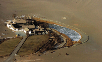作為庫(kù)姆塔格沙漠東部邊緣的一個(gè)綠洲,干旱、缺沙和沙漠化,一直嚴(yán)重威脅著敦煌的生態(tài)環(huán)境。據(jù)敦煌市水利等部門觀測(cè),1975年至2001年,敦煌綠洲地下水位下降了10.77米,每年以0.24米的速度在下降。由于水資源短缺和地下水位下降,敦煌市原有的1萬(wàn)畝咸水湖和千余畝淡水湖的80%已不存在,大面積天然林和濕地也在逐年萎縮。蘭州大學(xué)公布的一項(xiàng)調(diào)查研究表明,沙漠化已對(duì)敦煌境內(nèi)文物古跡造成嚴(yán)重威脅,許多重要文物遺址處在重度和中度沙漠化地帶,一些文物遺跡已經(jīng)受到嚴(yán)重危害。