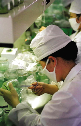 馬鈴薯工程技術研究中心工作人員在研究室培育馬鈴薯脫毒薯苗。本報記者 梁強