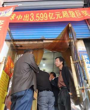 開出3.6億巨獎(jiǎng)的河南安陽這家彩票投注站在門頭上懸掛出宣傳條幅。這家投注站因?yàn)檎戳司揞~大獎(jiǎng)的喜氣,生意紅紅火火,營業(yè)額成倍攀升,不少外省市的彩民專程跑到這里購買彩票,期望能夠碰上好運(yùn)氣。