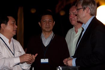 在8月末的達(dá)沃斯領(lǐng)袖論壇會議上,澳大利亞總理陸克文(右一)會見兗州煤業(yè)董事長王信(左一),高度評價兗礦的采煤技術(shù)和赴澳開發(fā)的澳思達(dá)煤礦,并表示對中國投資的歡迎。李俊