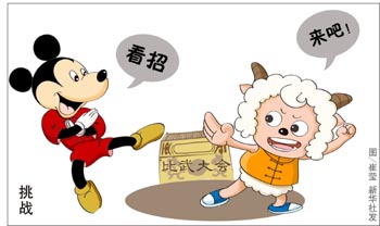 “迪士尼里有喜羊羊和灰太狼嗎?”聽到媽媽說2012年要帶自己去上海逛迪士尼樂園,5歲的小雅抱著喜羊羊的毛絨玩偶好奇地問。在她天真爛漫的小心靈里,喜羊羊和灰太狼的地位一點(diǎn)兒也不比米老鼠和唐老鴨遜色,因?yàn)樗鼈兌寄芰钏械娇鞓贰?BR> 今年電影版的《喜羊羊和灰太郎》吸取美國《貓和老鼠》經(jīng)驗(yàn),在前期培育了大批忠實(shí)觀眾的基礎(chǔ)上,最終取得了創(chuàng)意和票房的雙豐收。有人認(rèn)為,中國年輕的動(dòng)漫產(chǎn)業(yè)或能借此契機(jī)迎頭趕上;但是,比起以迪士尼為代表的美日動(dòng)漫王國,喜羊羊是否已經(jīng)具有抗衡米老鼠的能力?