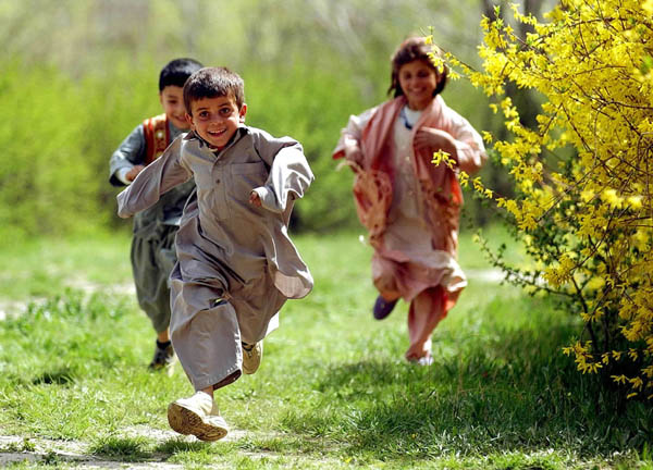 幾名阿富汗兒童在首都喀布爾一處花園的鮮花綠草間玩耍。新華社記者 王雷 攝
