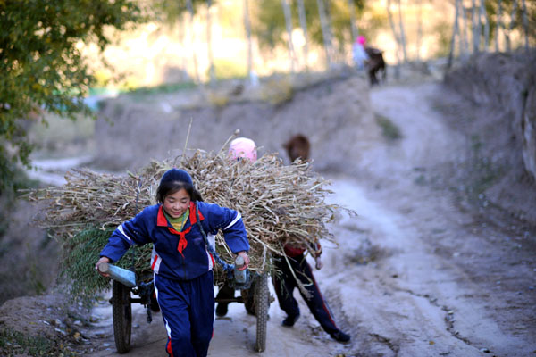 寧夏南部山區(qū)12歲的海琴幫媽媽拉架子車。新華社記者 劉泉龍 攝