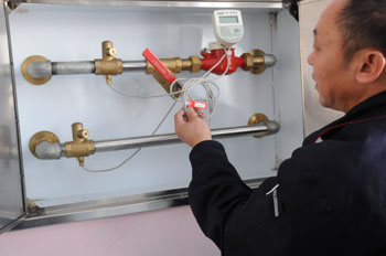 沈陽航發(fā)熱計量技術(shù)有限公司技術(shù)人員正在演示入戶熱計量表的使用方法。