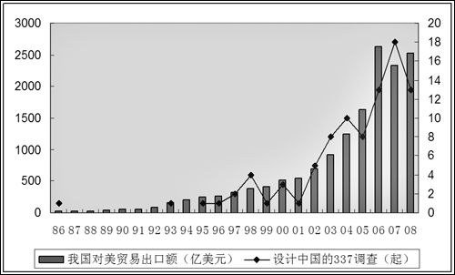 隨著中國改革開放的不斷深化和對外出口的快速增長,中國對美貿易出口額連年遞增,從1979年5.95億美元增加到2008年的2523億美元。在中國對美貿易出口額連年遞增的背景下,針對中國企業(yè)的337調查也如影隨形。(見圖3)