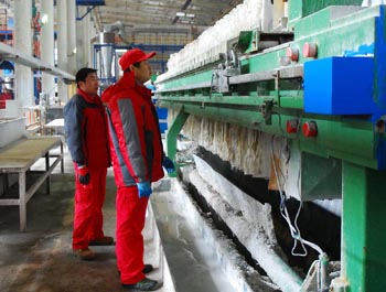 2009年12月26日,青海中信國安科技發(fā)展有限公司本年度第5000噸碳酸鋰下線。這標志著青海省“鹽湖提鋰”已進入工業(yè)化階段,國外碳酸鋰巨頭對中國市場的壟斷宣告結束。 圖為青海中信國安科技發(fā)展有限公司兩名工人在觀察設備運轉。新華社記者 吳光于