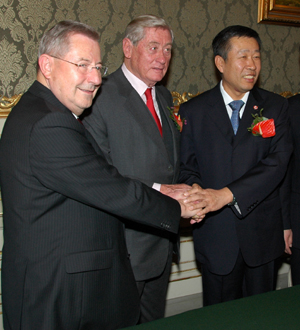 C公司監(jiān)理會副主席沙林格(前)、監(jiān)理會主席安德魯施、中國航空工業(yè)集團(tuán)副總經(jīng)理耿汝光(后)在股權(quán)交割后相互握手祝賀。新華社記者 劉鋼/攝 |
