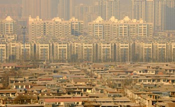 石家莊一個城中村與遠處高樓相映襯,城中村由于租房價格低廉成為很多低收入家庭的聚居區(qū),而樓房則是他們中很多人遙不可及的夢想。新華社記者 鞏志宏