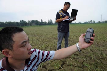 2009年7月15日,安徽六安市國元農(nóng)業(yè)保險公司的員工在舒城縣百神廟鎮(zhèn)開展查災定損賠付工作,工作人員用GPS衛(wèi)星定位儀確定受災田塊的經(jīng)緯度和面積。新華社發(fā)(陳力