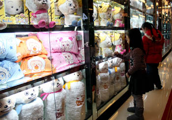 日前,小朋友們被北京一家影院展示的“喜羊羊”玩具吸引。“喜羊羊”掀起的國產(chǎn)動漫熱,帶動了玩具、文具、服裝等動漫衍生產(chǎn)品的發(fā)展。新華社發(fā) 趙琬微/攝 |