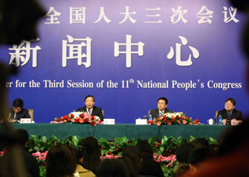 3月9日,中國人民銀行副行長、國家外匯管理局局長易綱(左一)就“外匯管理和外匯儲備”問題在北京梅地亞中心接受中外媒體的集體采訪。易綱重申,要保持人民幣匯率在合理、均衡水平上的基本穩(wěn)定。新華社記者 袁滿 攝 | 聚焦 1 周小川:擇機(jī)退出危機(jī)時期人民幣匯率政策