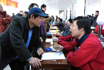 2010年春節(jié)過后,天津市100多家用人單位招聘現(xiàn)場提供了2萬多個崗位,而進場求職的農(nóng)民工僅有近萬人次。新華社記者 劉海峰/攝 |