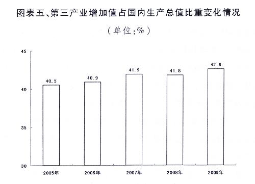服務(wù)業(yè)穩(wěn)定發(fā)展。鼓勵(lì)服務(wù)業(yè)發(fā)展的政策措施得到進(jìn)一步落實(shí),財(cái)稅、供地、價(jià)格、金融等方面對(duì)現(xiàn)代服務(wù)業(yè)的支持力度加大,一批跨地區(qū)、跨行業(yè)、帶動(dòng)功能強(qiáng)、支撐作用大的服務(wù)業(yè)重大項(xiàng)目建設(shè)順利開展。金融保險(xiǎn)、信息服務(wù)、物流配送、社區(qū)服務(wù)等發(fā)展迅猛,新興業(yè)態(tài)不斷涌現(xiàn)。第三產(chǎn)業(yè)增加值占國內(nèi)生產(chǎn)總值的比重達(dá)42.6%,比上年提高0.8個(gè)百分點(diǎn)。