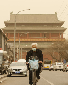3月22日,在北京鼓樓附近,一位老人在沙塵中騎行。新華社記者 沈伯韓