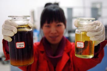 青海潔神環(huán)境能源產(chǎn)業(yè)有限公司工作人員在對比“地溝油”(左)和由餐廚垃圾處理而成的生物柴油。新華社記者 張宏祥