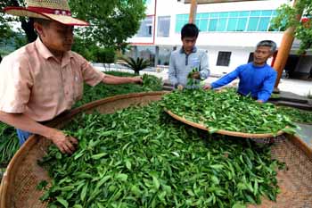 武夷山茶農(nóng)按傳統(tǒng)制作技藝對(duì)茶青進(jìn)行手工搖青。 記者 張國(guó)俊/攝