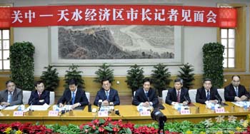 | 2010年4月9日,關中—天水經濟區(qū)“七市一區(qū)”市長在西安與中外媒體記者見面,通報《關中—天水經濟區(qū)發(fā)展規(guī)劃》實施情況。資料照片 |