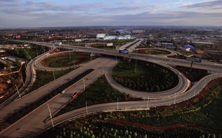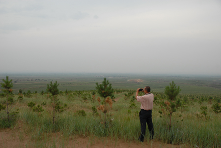 ▲大圖為一位游人正在朔州西山公園高處攝影。左上小圖為西山公園與市區(qū)連接的公路。七、八年前,這里還是成片的荒山荒坡,起風就揚沙。